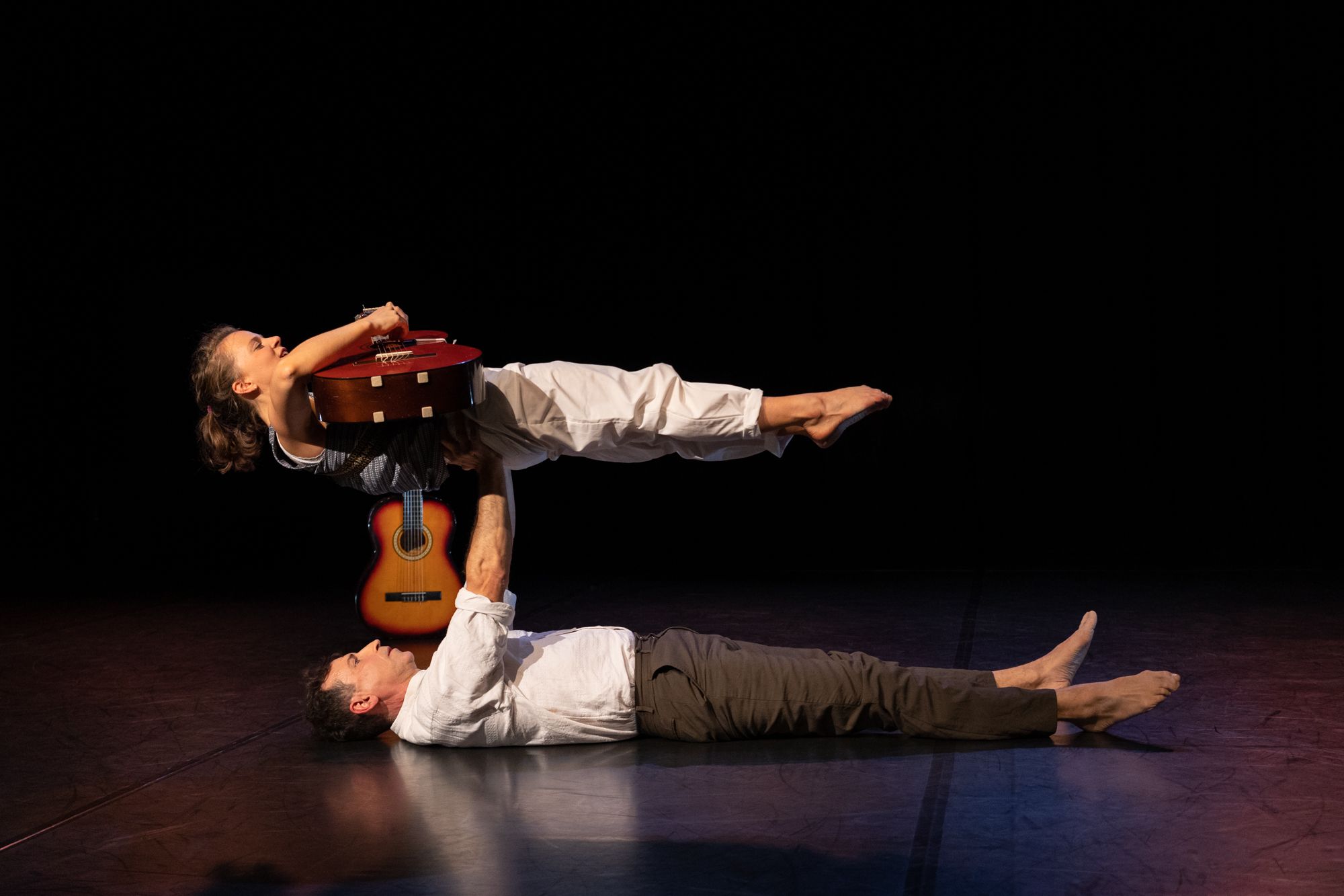 Ein musikalisches/artistisches Stück mit zwei Gitarren, einer Musikerin und einem Akrobaten.